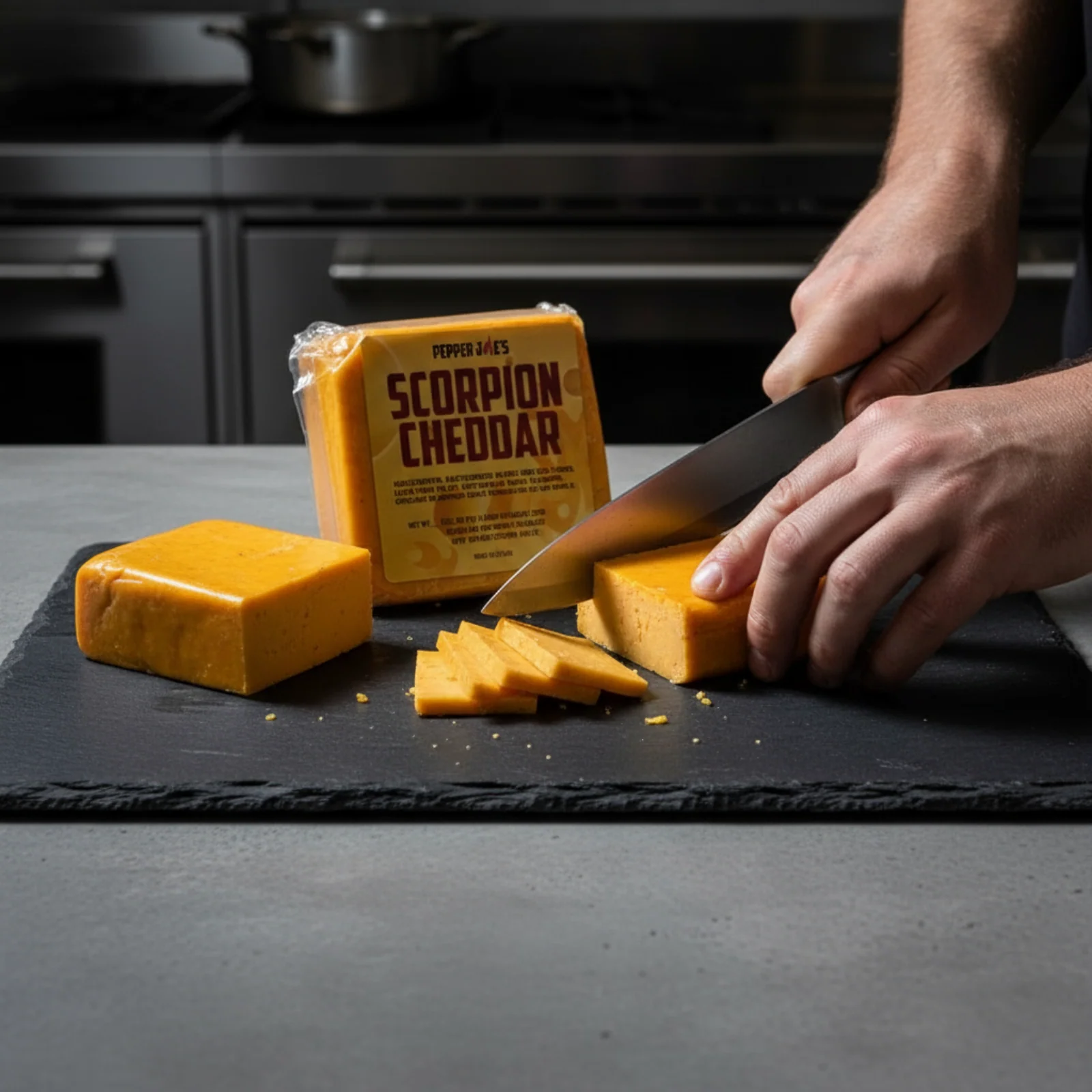 🧀 Scorpion Cheddar Cheese – Creamy Wisconsin Cheddar with Scorching Scorpion Pepper Heat